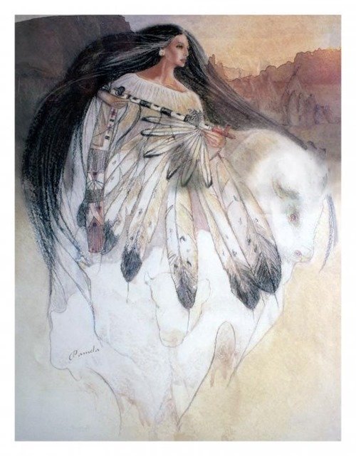 Lorsque la pipe termina le cercle, elle la posa contre le crâne du bison. Elle leur dit, « Dans l’avenir, chacun de vous aura une pipe. Portez-la toujours, et le Grand Esprit vous aidera sur votre chemin à travers la vie ».