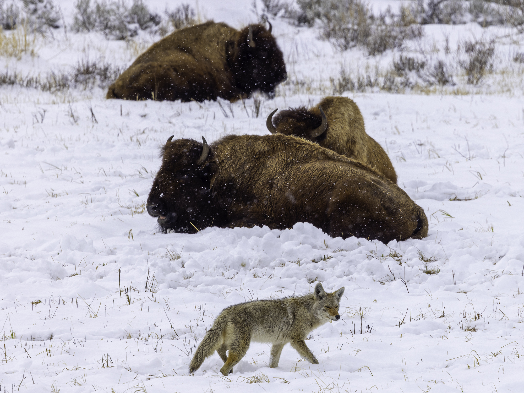 "Bisons et Coyote" - Yellowstone, lors du voyage de Corine Mystery, en avril 2024.