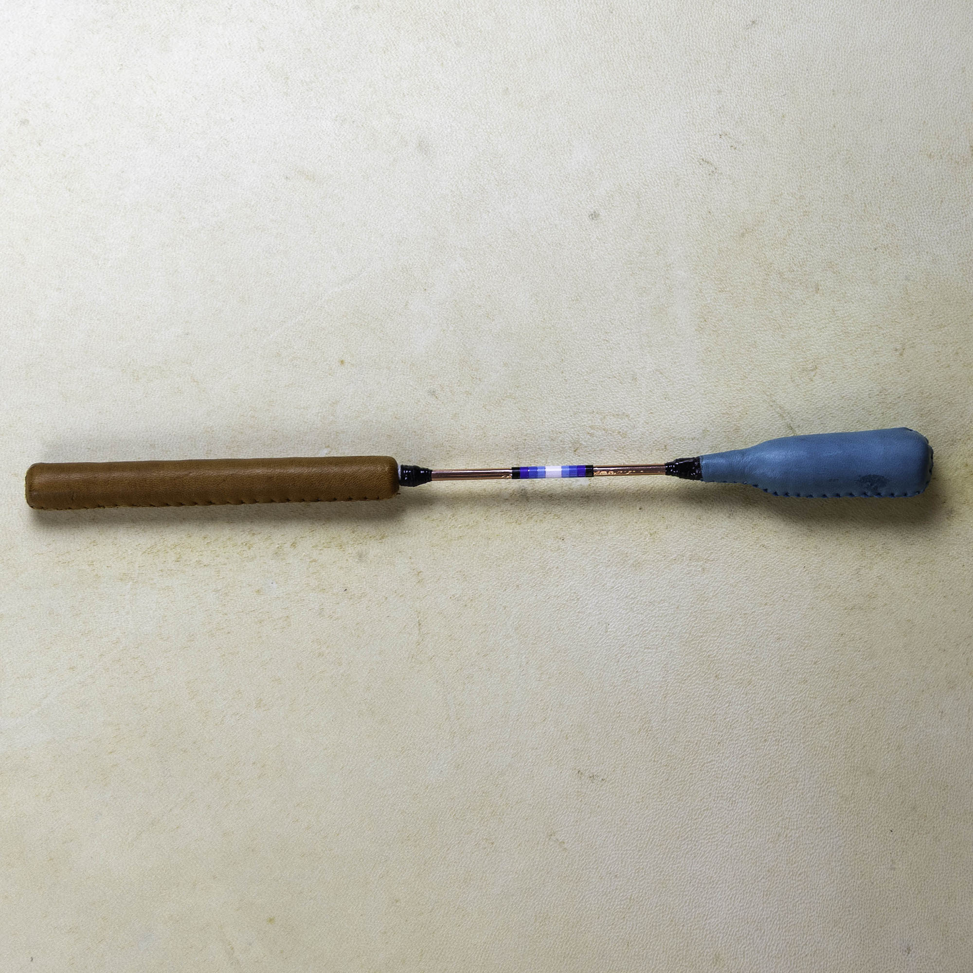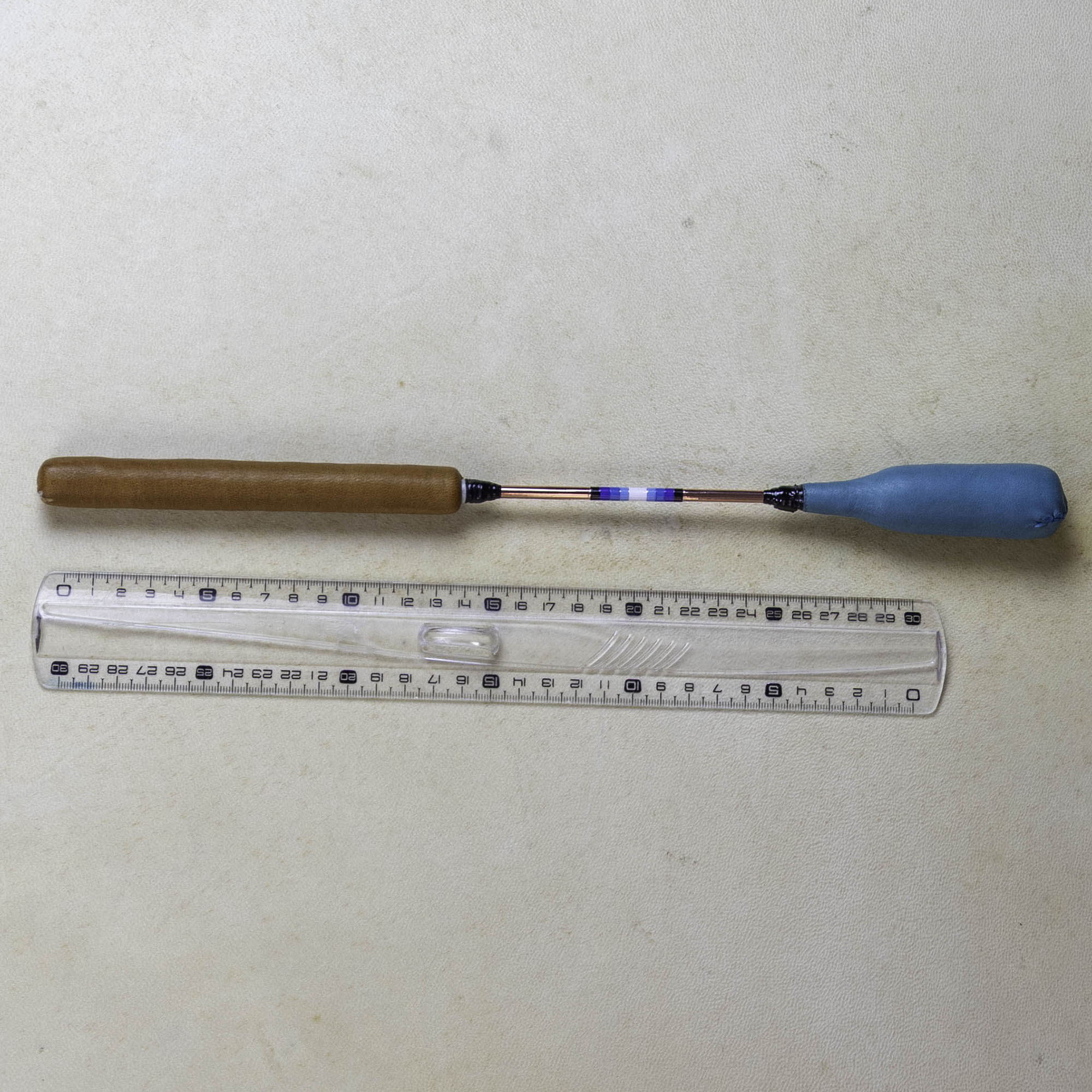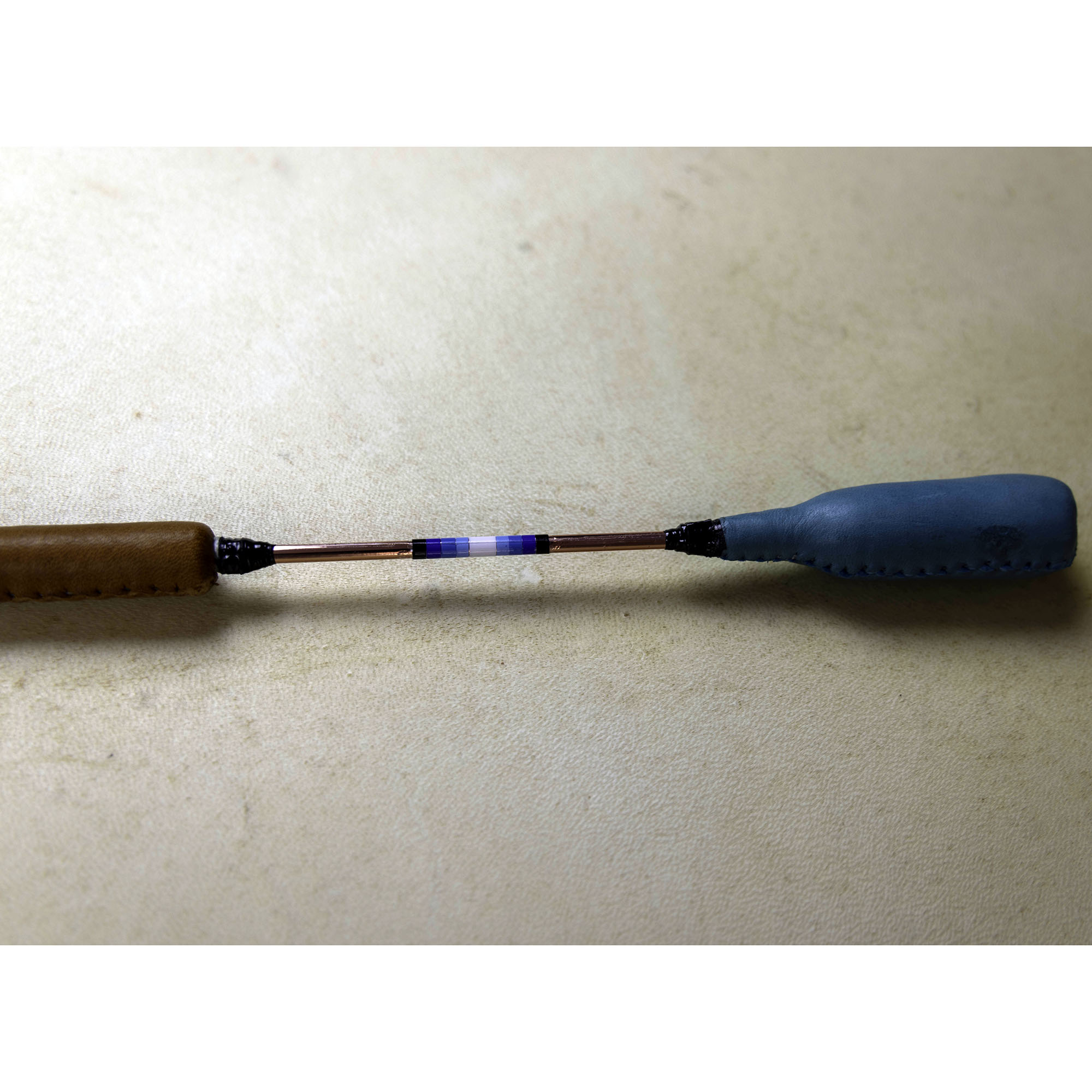 Tige en cuivre (plus solide que le bois), ornée de perles. Manche en cuir.