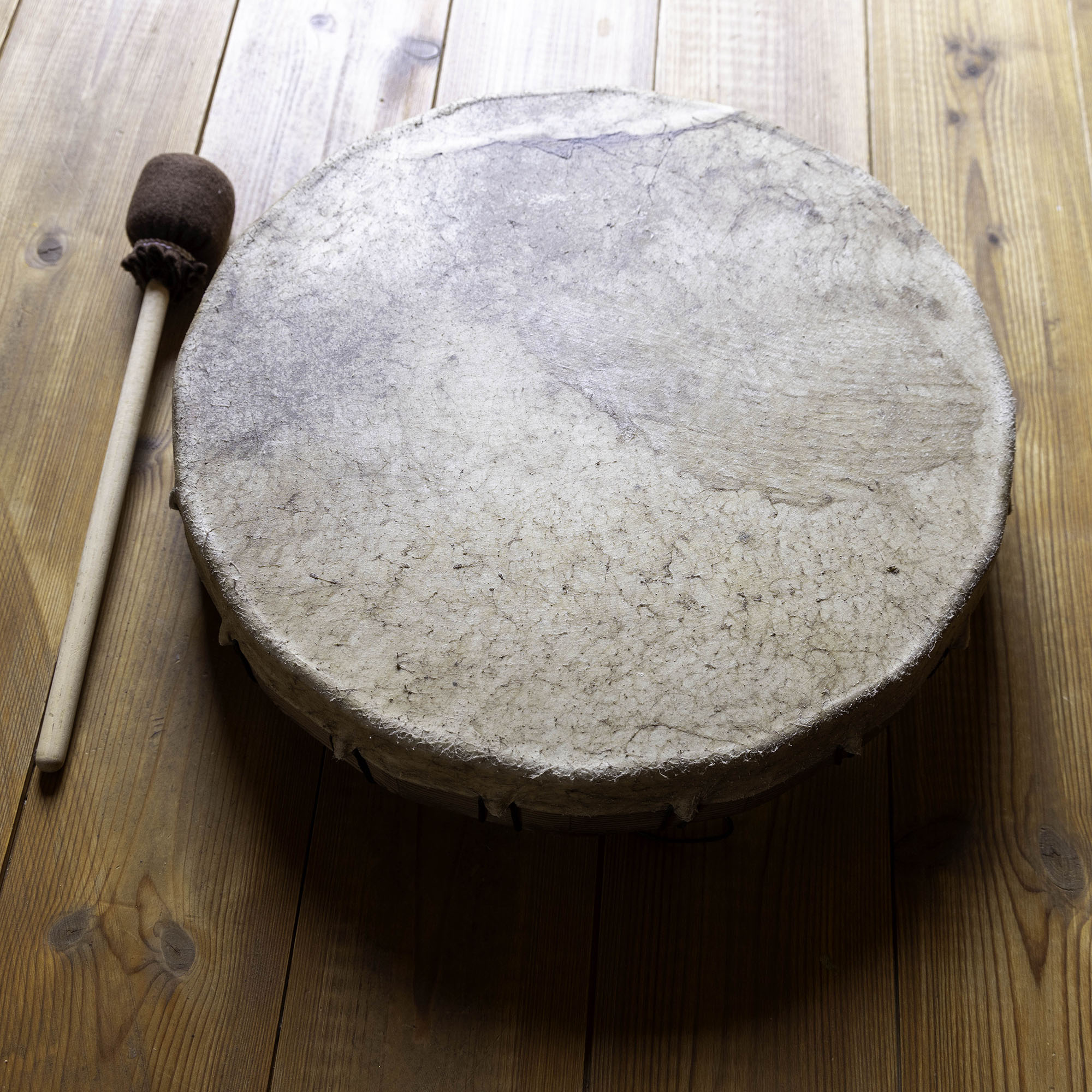 Ce beau tambour de forme circulaire est en peau de poney et bois de cèdre rouge.